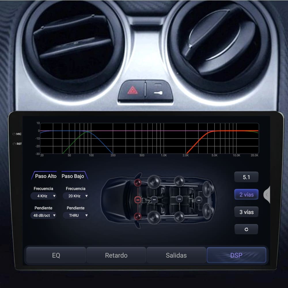 - Crossover electrónico configurable: Sistema 2 vías activo, 3 vías activo, o incluso 5.1